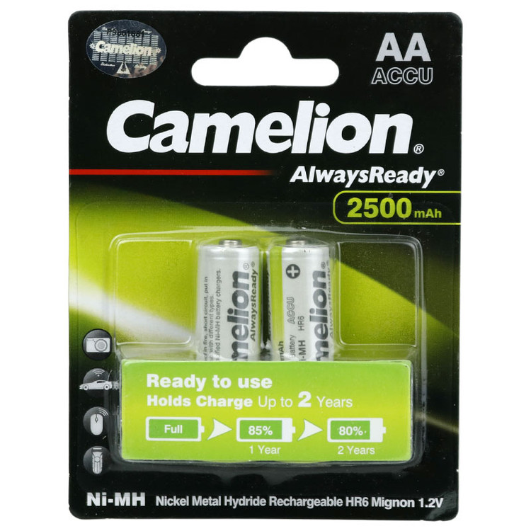 باتری از نوع قلمی AA به تعداد دو عدد در بسته با ظرفیت ۲۵۰۰ میلی آمپر ساعت و ولتاژ برابر با ۱٫۲ ولت