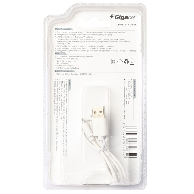 بدنه ساخته شده از جنس پلاستیک باکیفیت، برخورداری از ۴ عدد ورودی به منظور شارژ باتری هامجهز به یک درگاه میکرو USB جهت اتصال به برق شهری از طریق کابل MicroUSB همراه جهت شارژ باتری هاپشتیبانی از شارژ باتری های AA و AAA با شدت جریان خروجی ۳۰۰ میلی آمپر در ولتاژ ۱٫۴ آمپر (در باتری قلمی) و ۲۵۰ میلی آمپر در ولتاژ ۱٫۴ ولت (در باتری نیم قلمی)برخورداری از نشانگر LED جهت نمایش وضعیت شارژ با نمایش رنگ قرمز هنگام شارژ شدن، رنگ سبز پس از شارژ کامل و وجود اتصال کوتاه یا باتری نامناسب و معیوب با رنگ قرمز چشمک زن