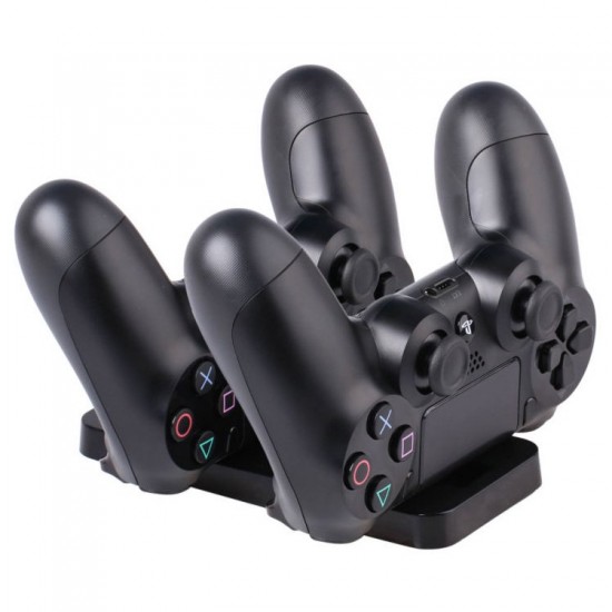 استند شارژ DualShock 4 محصول Dobe به شما این امکان رو میدهد تا دو کنترلر پلی استیشن 4 را به صورت همزمان شارژ کنید. این استند کنترلرهای شما را با پورت miniUSB شارژ میکنند و دارای آداپتور برای اتصال به پریز برق است و لازم نیست آن را به پلی استیشن 4 متصل کنید.