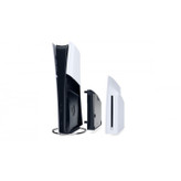پلی استیشن 5 اسلیم برای قرار گرفتن در حالت افقی بسیار خوب طراحی شده است. استندهای دوطرفه زمخت و بد قیافهی نسخه معمولی حالا با دو میخ پلاستیکی کوچک جایگزین شدهاند که در بخشهای کنار کنسول قرار دارند و کنسول را ثابت نگهمیدارند. متاسفانه پلی استیشن 5 اسلیم همراه با یک استند عرضه نمیشود. بخاطر نازکتر بودن پلی استیشن 5 اسلیم نسبت به نسخه قبلی، جایگیری و قرار دادن در حالت عمودی ثباتی که باید را ندارد. برای همین هم سونی نسخهای جدید از استند برای کنسول خود طراحی کرده است که از استند قبلی بهتر بوده. این استند با جنس فلزی خود کنسول شما را را با ثبات بهصورت عمودی نگهداشته و تکان خوردن کنسول را عملا غیر ممکن میکند. این استند به علاوه با پلی استیشن 5 معمولی نیز سازگار است. لازم به ذکر است که استند عمودی پلی استیشن 5 به صورت جداگانه عرضه و فروخته میشود.